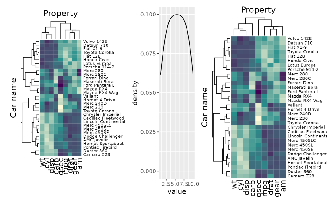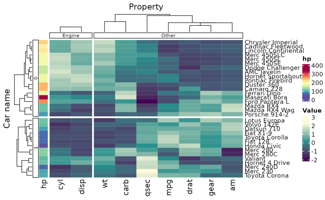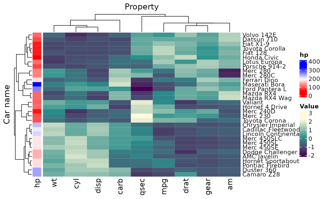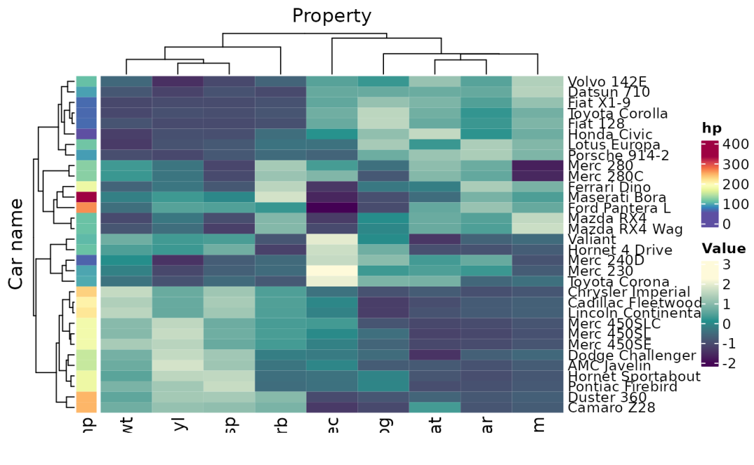 heatmap(`Car name`, Property, Value, scale = "row" ) |>
