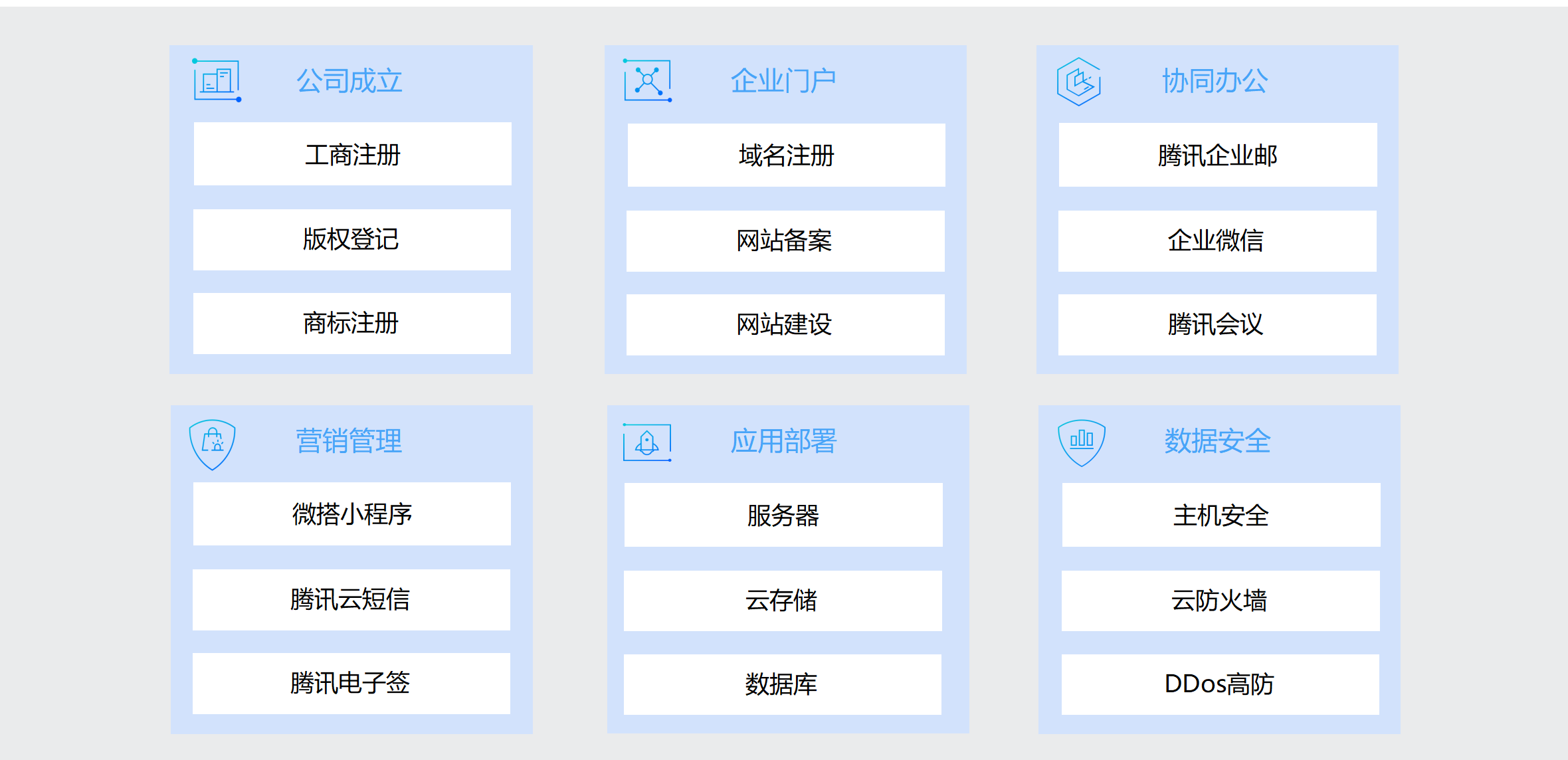 满足企业全生命周期业务场景需求,提供工商财税、企业办公、营销推广等产品能力,助力初创企业高效上云。