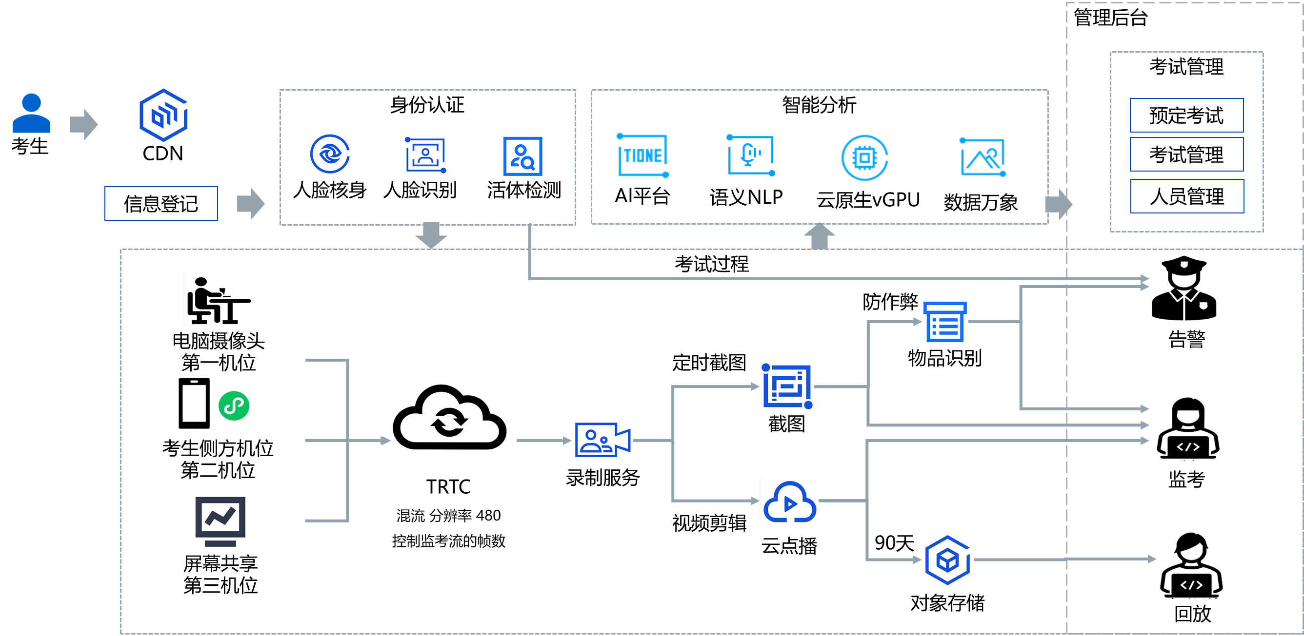 国内某头部在线考试服务商,基于腾讯云提供的在线监考方案,服务央国企等大型机构的线上考试,支持同时在线考试上万人。在保证同样的监考严肃性的前提下,极大的降低了线下组织考试的成本,提高了考试的效率。