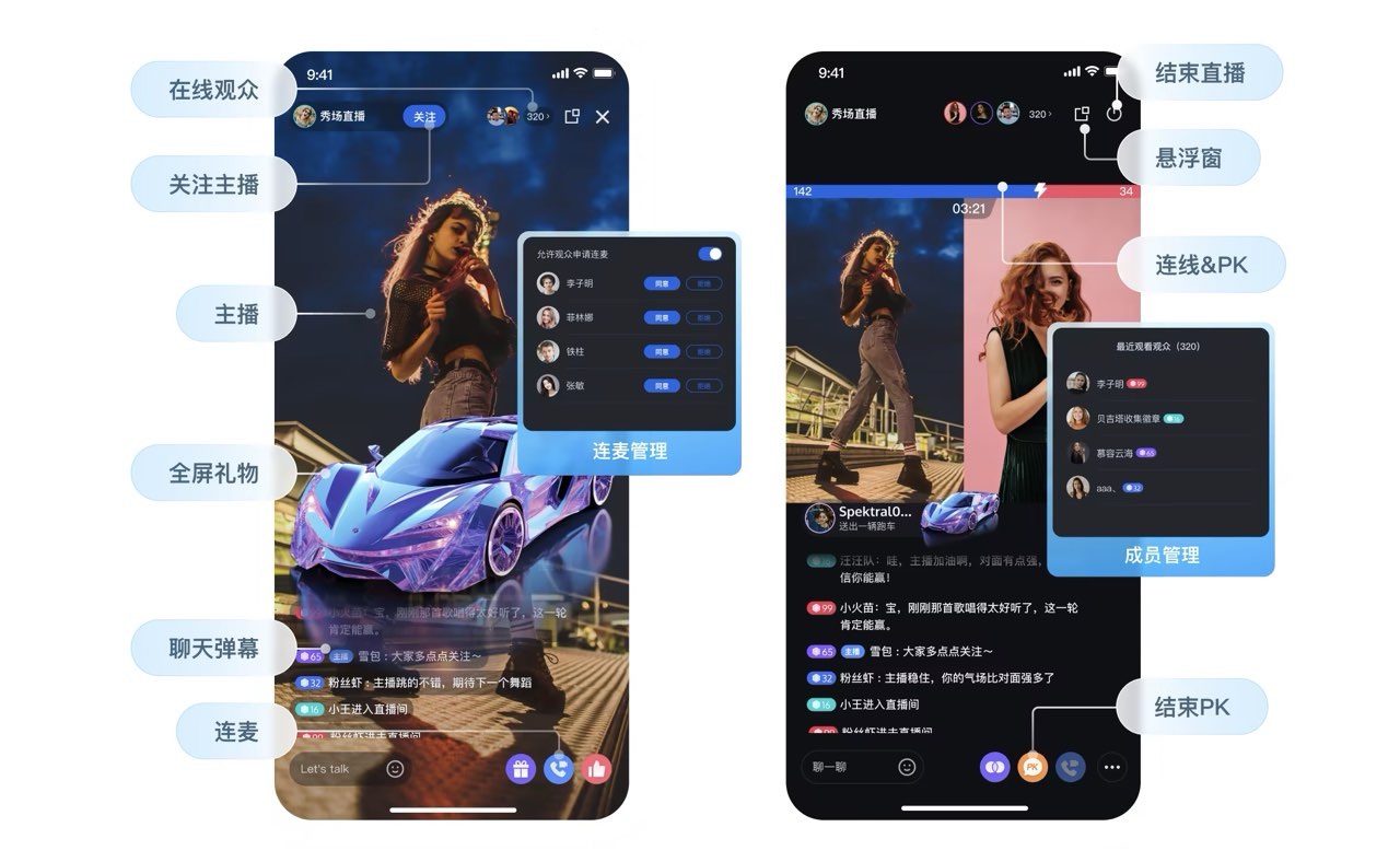 主播开播、分发观看、连麦、PK、弹幕、送礼、观众管理等功能 |