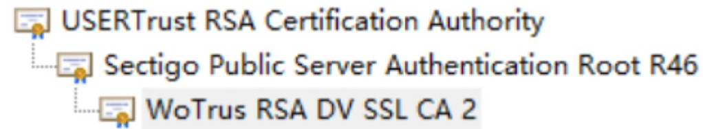 ● 启用新的中间根后,Wotrus(沃通)签发的 SSL 证书携带的证书链会同步更新为新根的证书链文件