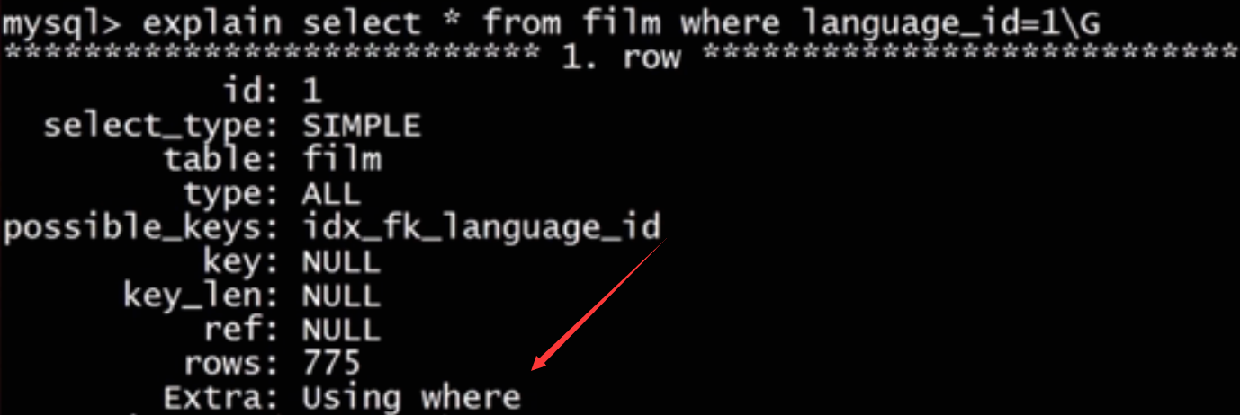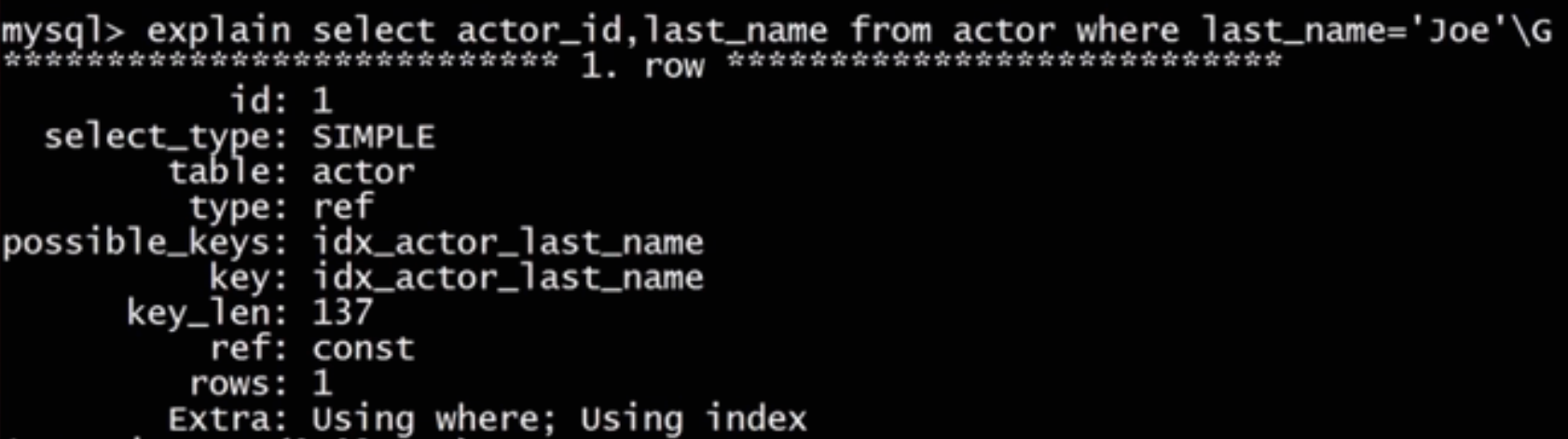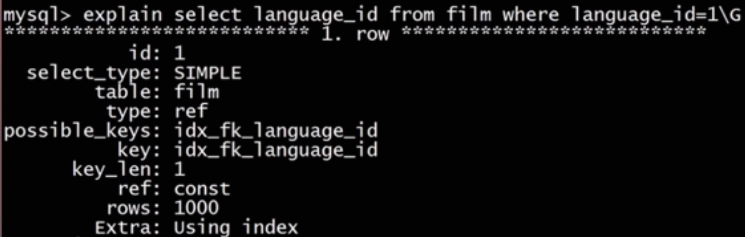 | id | select_type | table | type | possible_keys | key | key_len | ref | rows | Extra |