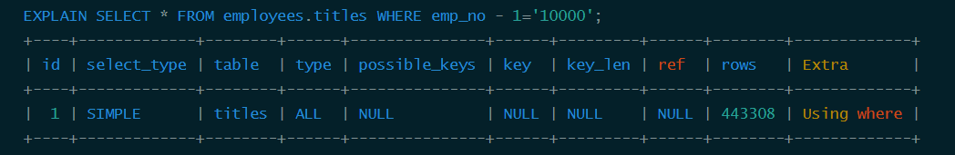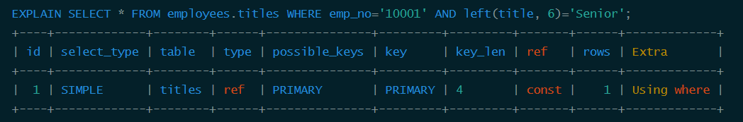 显然这个查询等价于查询emp_no为10001的函数,但是由于查询条件是一个表达式,MySQL无法为其使用索引。看来MySQL还没有智能到自动优化常量表达式的程度,因此在写查询语句时尽量避免表达式出现在查询中,而是先手工私下代数运算,转换为无表达式的查询语句。