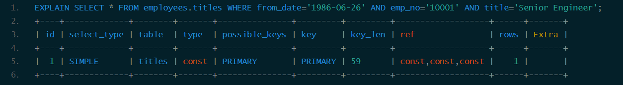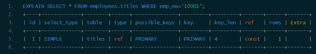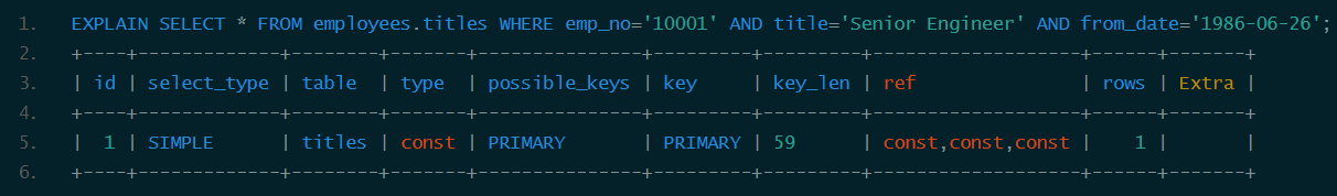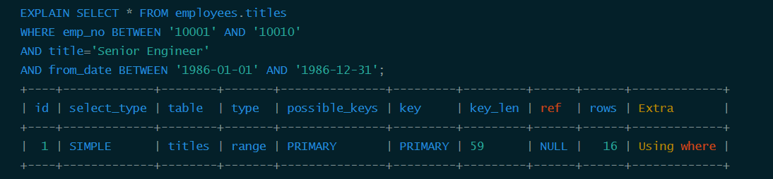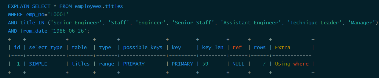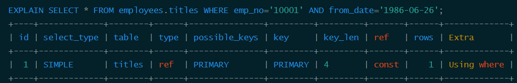 从结果中可以看到titles表的主索引为<emp_no, title, from_date>,还有一个辅助索引<emp_no>