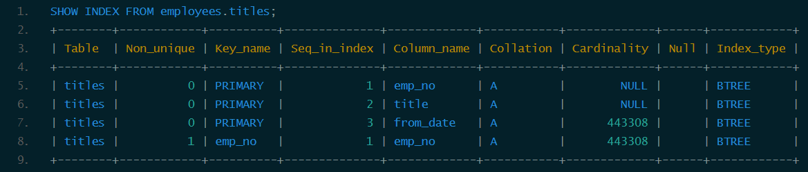以employees.titles表为例,下面先查看其上都有哪些索引: