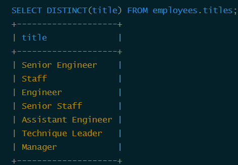 SELECT count(DISTINCT(title)) / count(*) AS Selectivity FROM employees.titles;