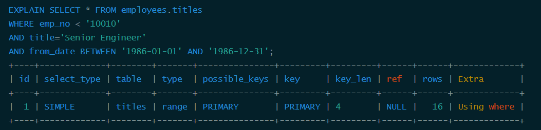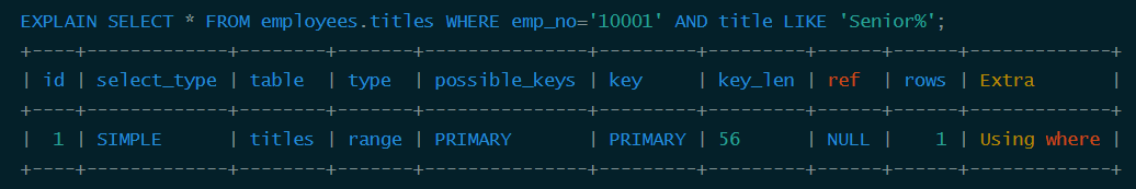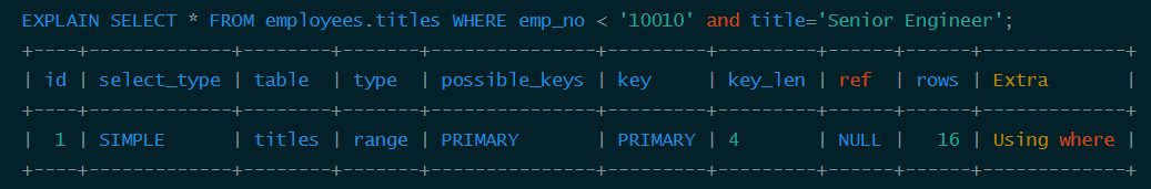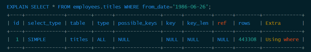 | 1 | SIMPLE | employees | ALL | NULL | NULL | NULL | NULL | 300024 | Using where |