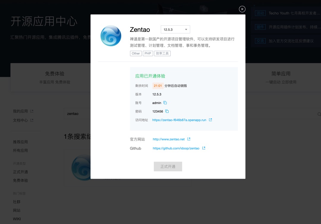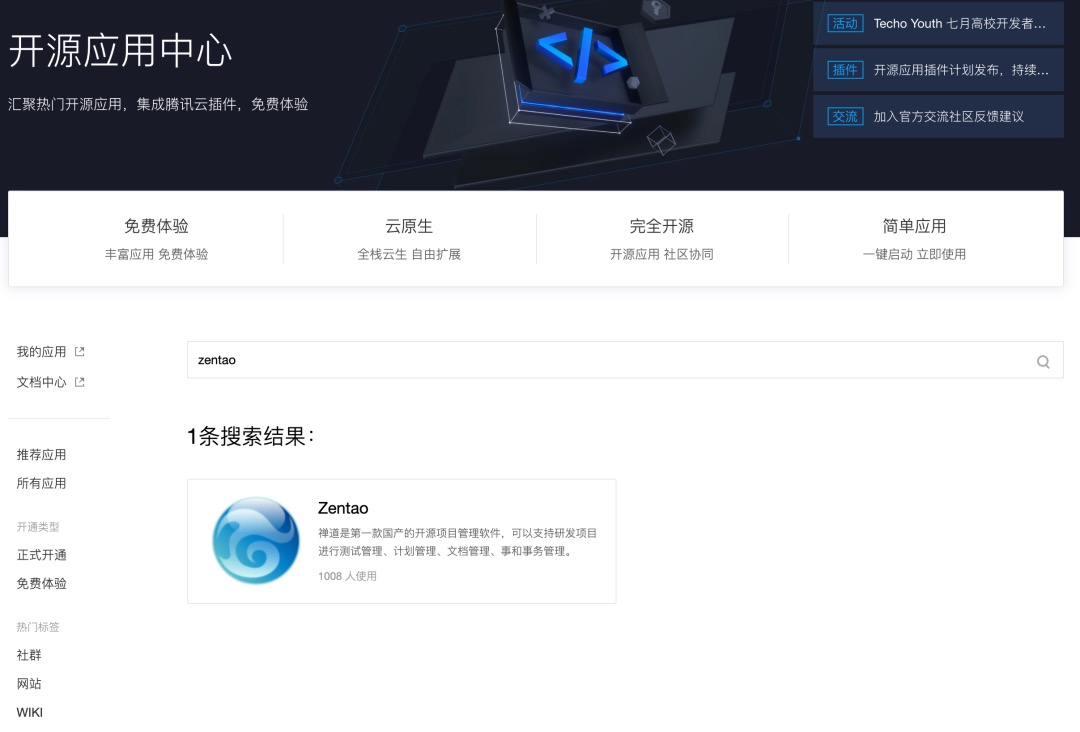 第一步:登录腾讯云开源应用中心(https://app.cloud.tencent.com/detail/Zentao)