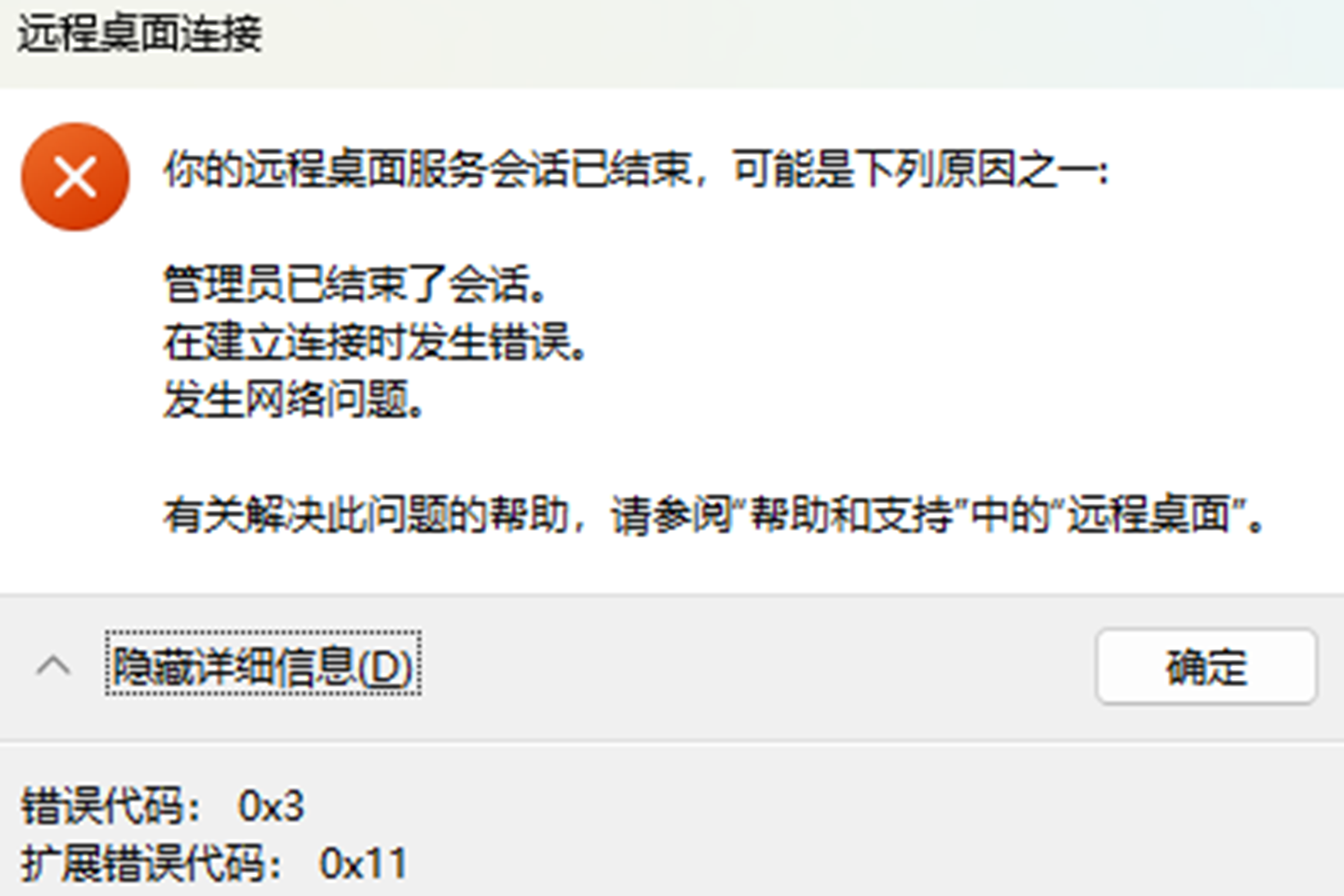 查看详细信息是Error code:0x3+Extended error code:0x11