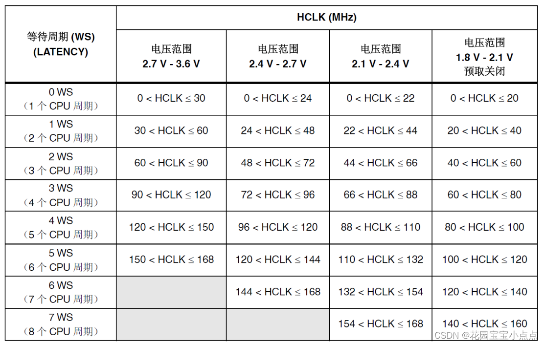 为了准确读取 Flash 数据, 必须根据 CPU 时钟 (HCLK) 频率和器件电源电压在 Flash 存取控制寄存器 (FLASH_ACR) 中正确地设置等待周期数 (LATENCY)。当电源电压低于 2.1V 时,必须关闭预取缓冲器。Flash 等待周期与 CPU 时钟频率之间的对应关系,如表所示: