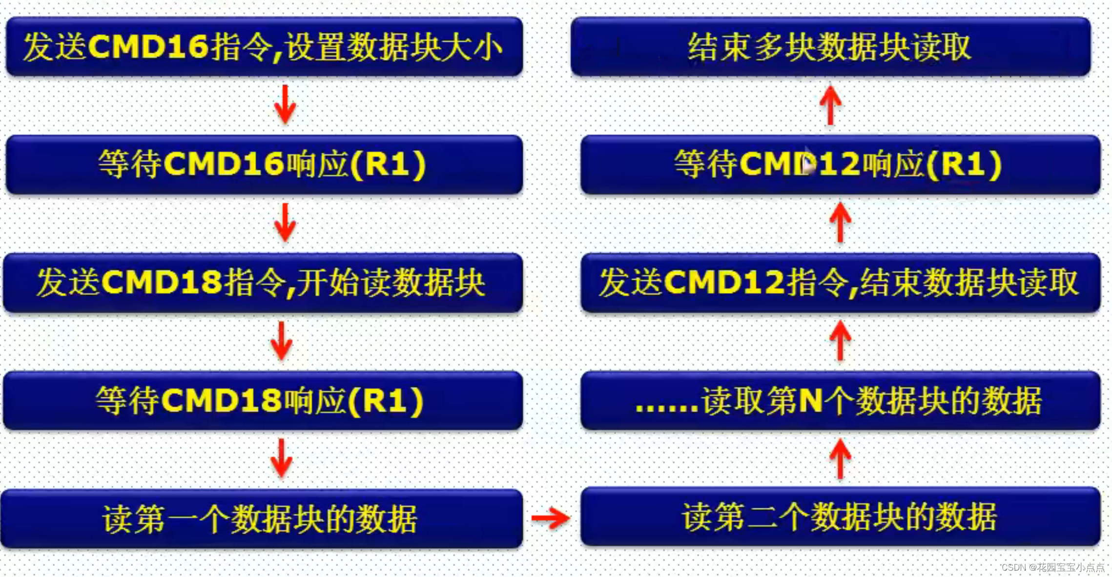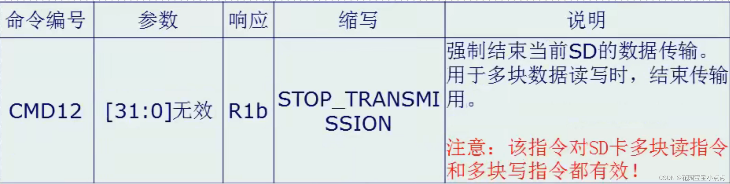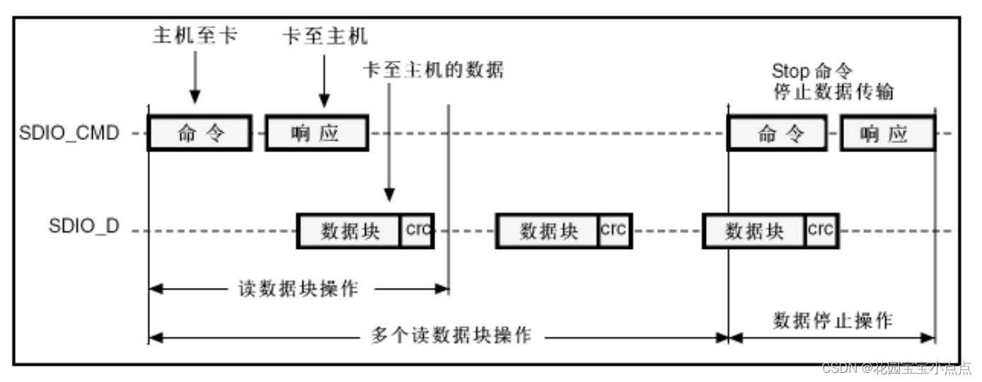 这个传输的过程,可以类比成我们上班的过程,首先老板叫你来上班(发送命令),然后来上班(响应),之后完成今天的工作(传输数据块),就可以下班了(停止)。但是如果老板叫你加班(连续传输),你就得一直干,干到什么时候呢?就是老板让你下班的时候((Stop)命令 ),然后你才可以下班(响应)。