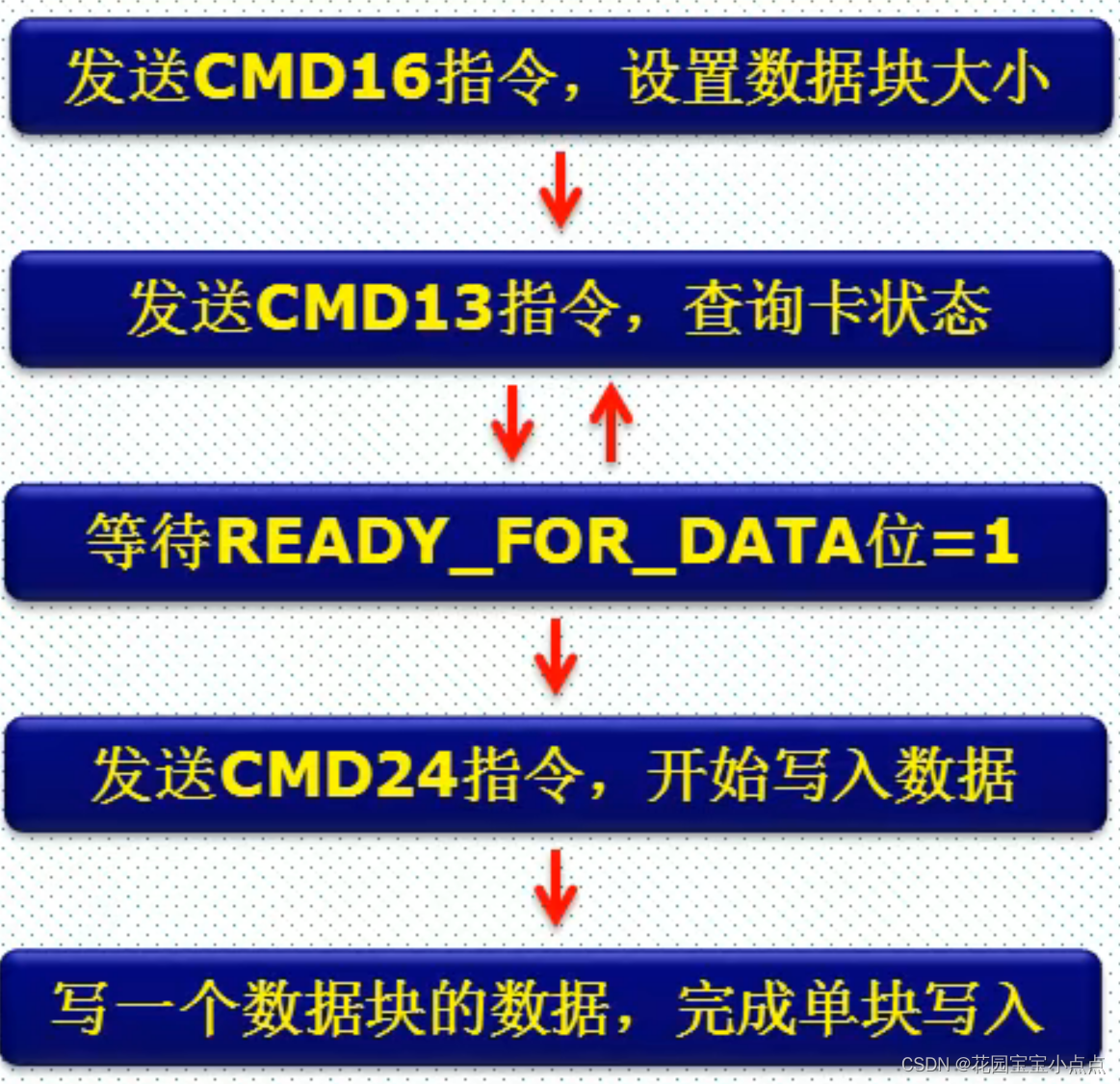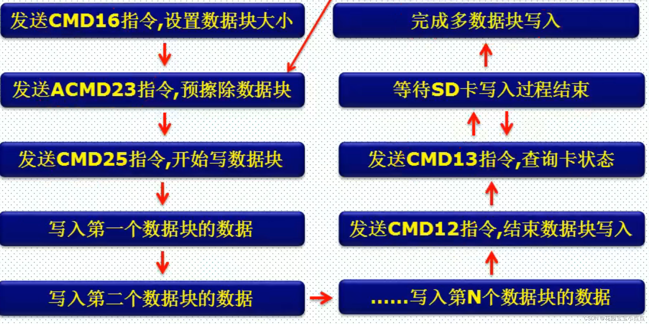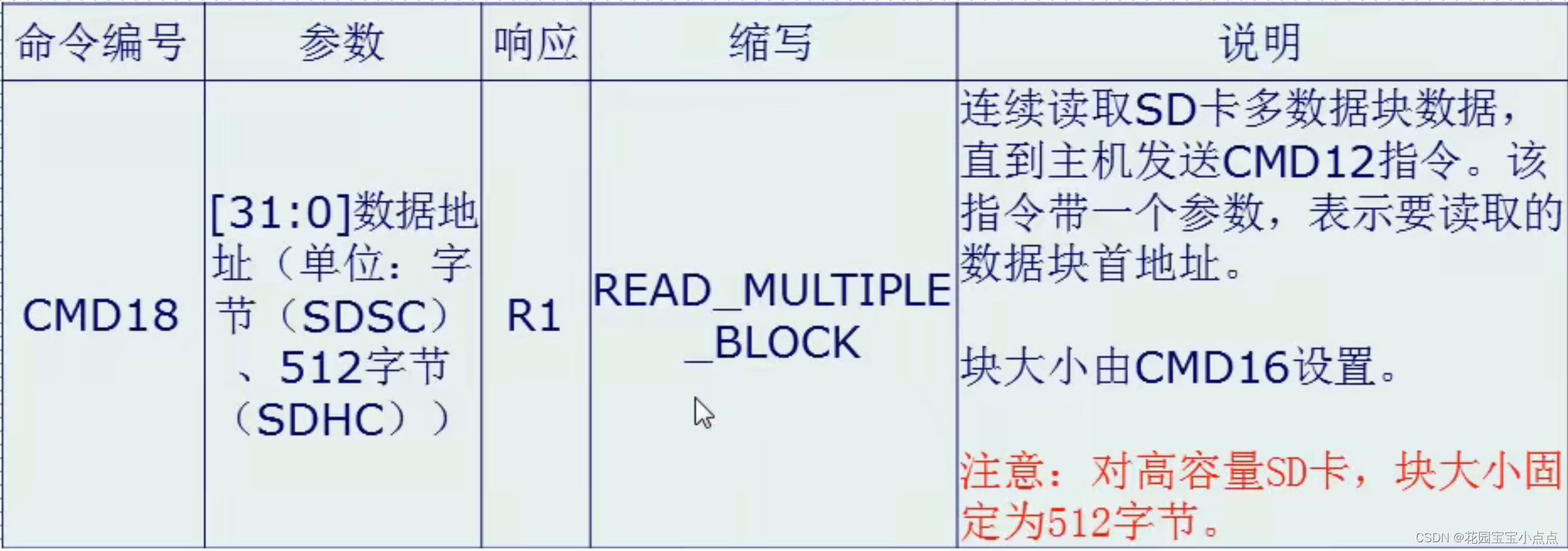 这个传输的过程,可以类比成我们上班的过程,首先老板叫你来上班(发送命令),然后来上班(响应),之后完成今天的工作(传输数据块),就可以下班了(停止)。但是如果老板叫你加班(连续传输),你就得一直干,干到什么时候呢?就是老板让你下班的时候((Stop)命令 ),然后你才可以下班(响应)。