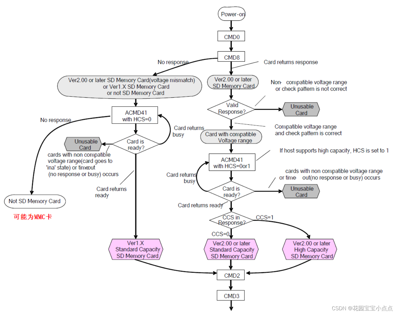 首先需要发送CMD0指令,进行软复位。之后是CMD8,带一个主机供电电压的参数。如果是2.0以后的卡而且电压在范围内,他就会响应,然后我们就可以知道这个SD卡的供电范围。之后我们发送ACMD41指令,然后会带一个参数来判断是不是高容量卡,如果是的话,CCS返回1,否则返回0。但是如果是1.0的卡或者电压范围不对,他就会走左边那条分支,我们也发送ACMD41指令,有响应就说明是1.0的卡,否者就是电压范围不对,如果压根没反应,就有可能是MMC卡了,之后发送一个CMD1的指令就行。