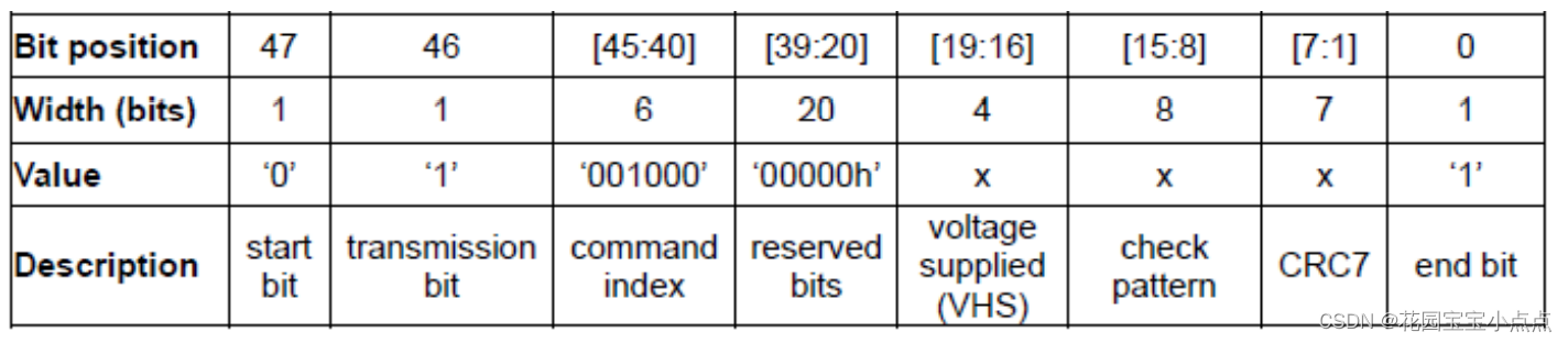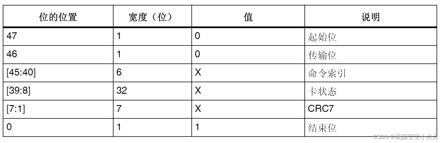 SD卡总共有6类响应(R1、R1b、R2、R3、R6、R7),我们这里以R1为例简单介绍一下。R1(普通响应命令)响应属于短响应,其长度为48位,如下表所示: