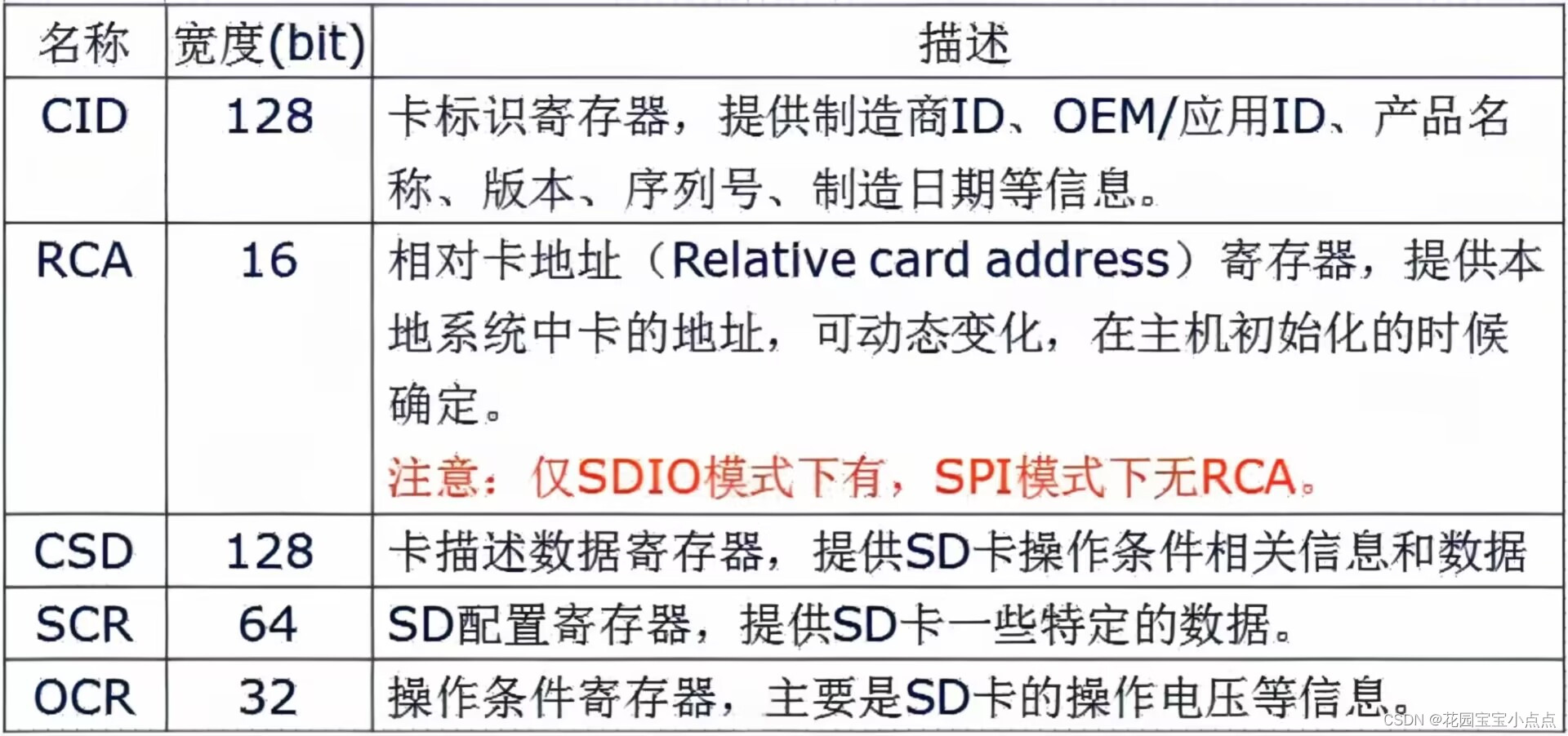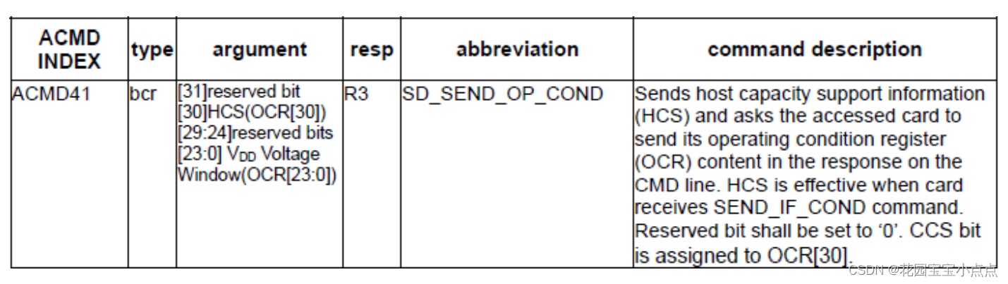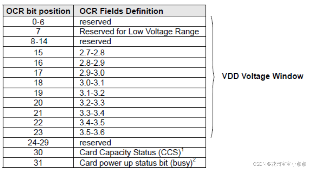 ACMD41 得到的响应(R3)包含 SD 卡 OCR 寄存器内容,OCR 寄存器内容定义如表 所示: