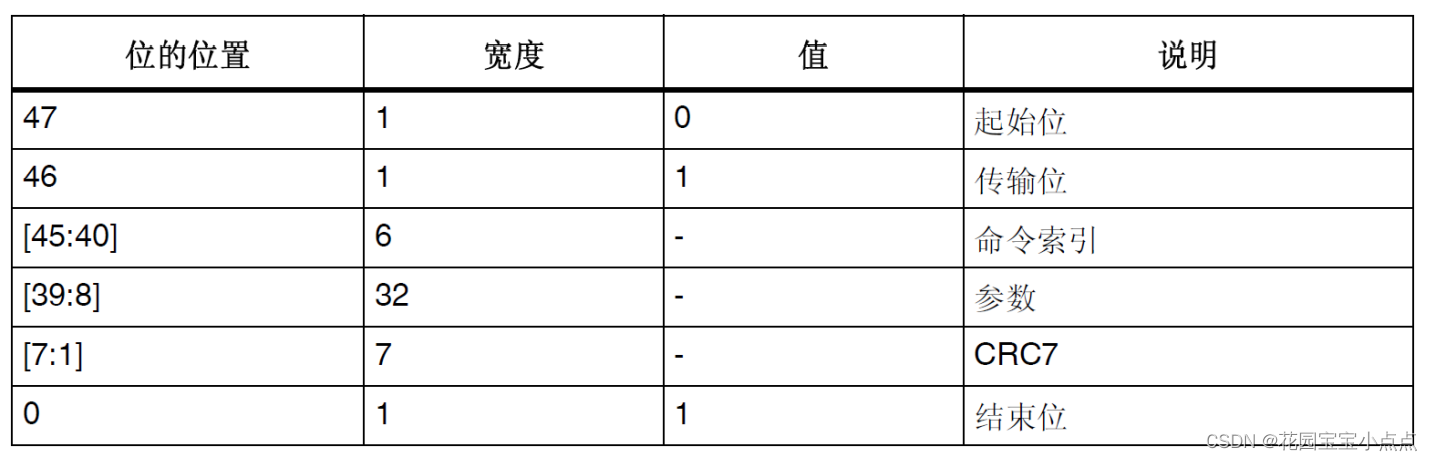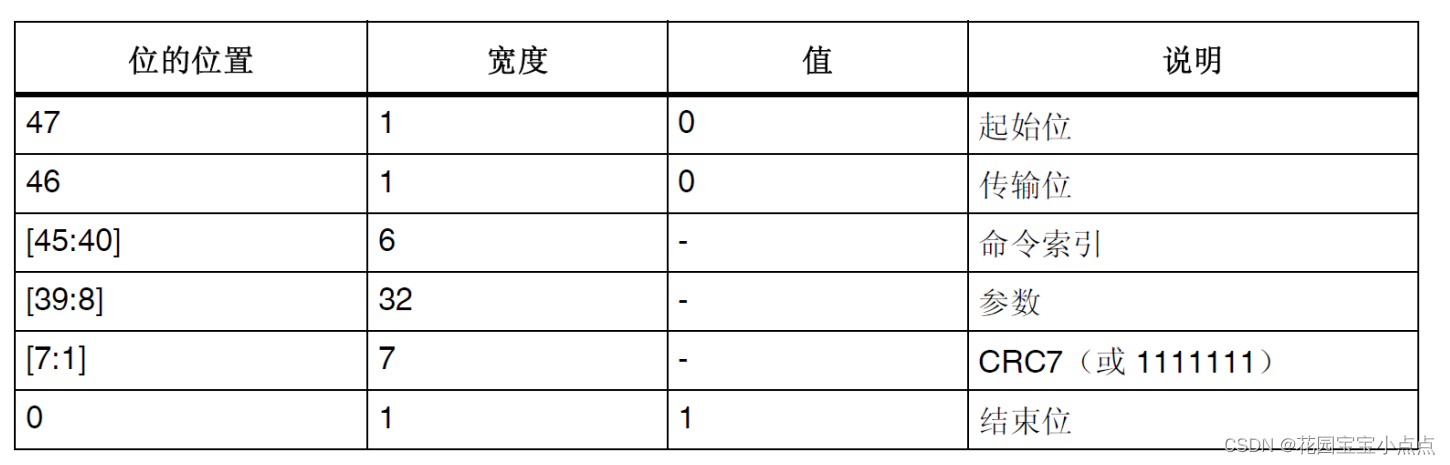 SDIO的命令分为:应用相关命令(ACMD)和通用命令(CMD)两部分。发送ACMD时,需先发送CMD55。 SDIO所有的命令和响应都是在SDIO_CMD引脚上面传输的,命令长度固定为48位,SDIO命令格式如下表所示: