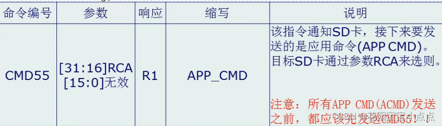 这里我们使用参数 0X1AA,即告诉 SD 卡,主机供电为 2.7~3.6V 之间,如果 SD 卡支持CMD8,且支持该电压范围,则会通过 CMD8 的响应(R7)将参数部分原本返回给主机,如果支持 CMD8,或者不支持这个电压范围,则不响应。 在发送 CMD8 后,发送 ACMD41(注意发送 ACMD41 之前要先发送 CMD55),来进一步确认卡的操作电压范围,并通过 HCS 位来告诉 SD 卡,主机是不是支持高容量卡(SDHC)。ACMD41 的命令格式如下所示: