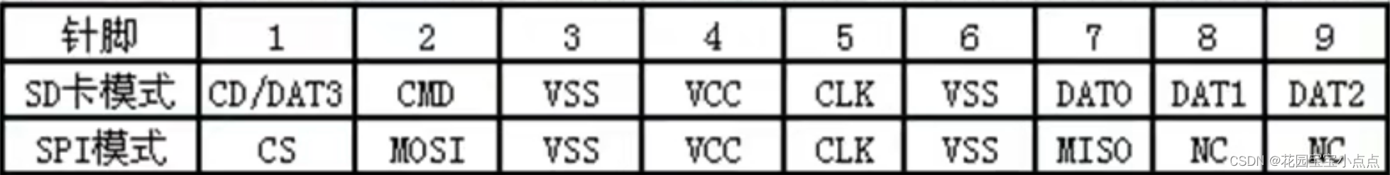 SD卡由9个引脚与外部通信,支持SPI和SDIO 两种模式,不同模式下,SD卡引脚功能描述如下表所示: