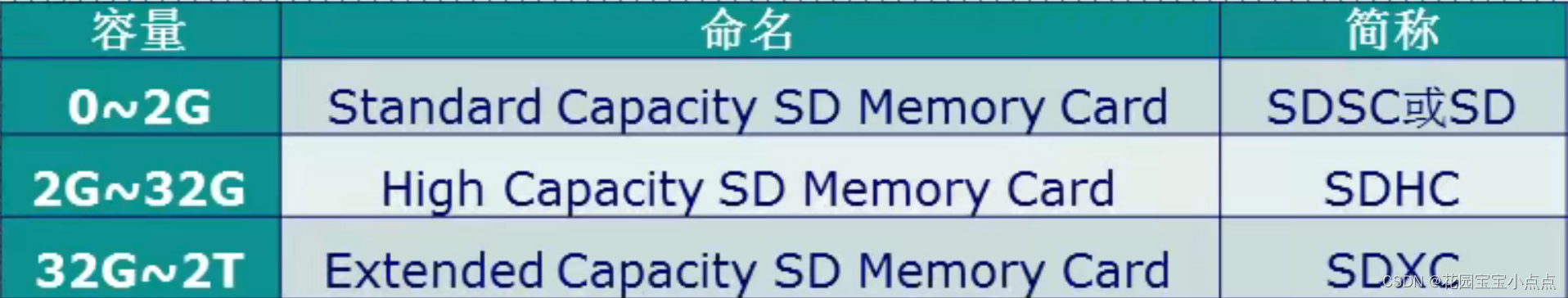 SD卡(Secure Digital MemoryCard)即:安全数码卡,它是在MMC的基础上发展而来,是一种基于半导体快闪记忆器的新一代记忆设备,它被广泛地于便携式装置上使用,例如数码相机、个人数码助理(PDA)和多媒体播放器等。SD卡由日本松下、东芝及美国SanDisk公司于1999年8月共同开发研制。 SD卡按容量分类,可以分为3类: SD卡、SDHC卡、SDXC卡,如下表所示: