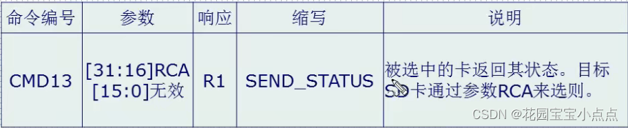 CMD3,用于设置卡相对地址(RCA,必须为非 0),对于 SD 卡(非 MMC 卡),在收到 CMD3 后,将返回一个新的 RCA 给主机,方便主机寻址。RCA 的存在允许一个 SDIO 接口挂多个 SD 卡,通过 RCA 来区分主机要操作的是哪个卡。而对于 MMC 卡,则不是由 SD 卡自动返回 RCA,而是主机主动设置 MMC 卡的 RCA,即通过 CMD3 带参数(高 16 位用于 RCA 设置),实现 RCA 设置。同样 MMC 卡也支持一个 SDIO 接口挂多个 MMC 卡,不同于 SD 卡的是所有的 RCA 都是由主机主动设置的,而 SD 卡的 RCA 则是 SD 卡发给主机的。 在获得卡 RCA 之后,我们便可以发送 CMD9(带 RCA 参数),获得 SD 卡的 CSD 寄存器内容,从 CSD 寄存器,我们可以得到 SD 卡的容量和扇区大小等十分重要的信息。