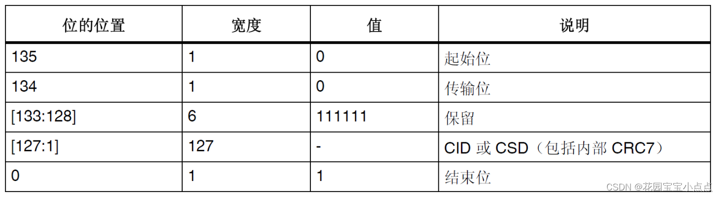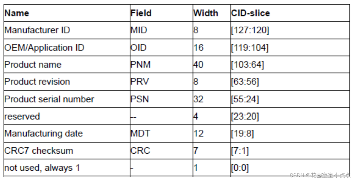 CMD2,用于获得 CID 寄存器的数据,CID 寄存器数据各位定义如下所示: SD 卡在收到 CMD2 后,将返回 R2 长响应(136 位),其中包含 128 位有效数据(CID 寄存器内容),存放在 SDIO_RESP1~4 等 4 个寄存器里面。通过读取这四个寄存器,就可以获得SD 卡的 CID 信息。