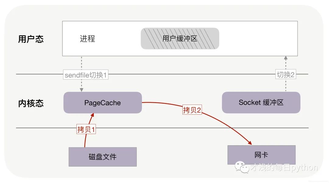 1、sendfile:直接从磁盘读到内核发送到网卡,不需经过用户态到内核态的拷贝转换。