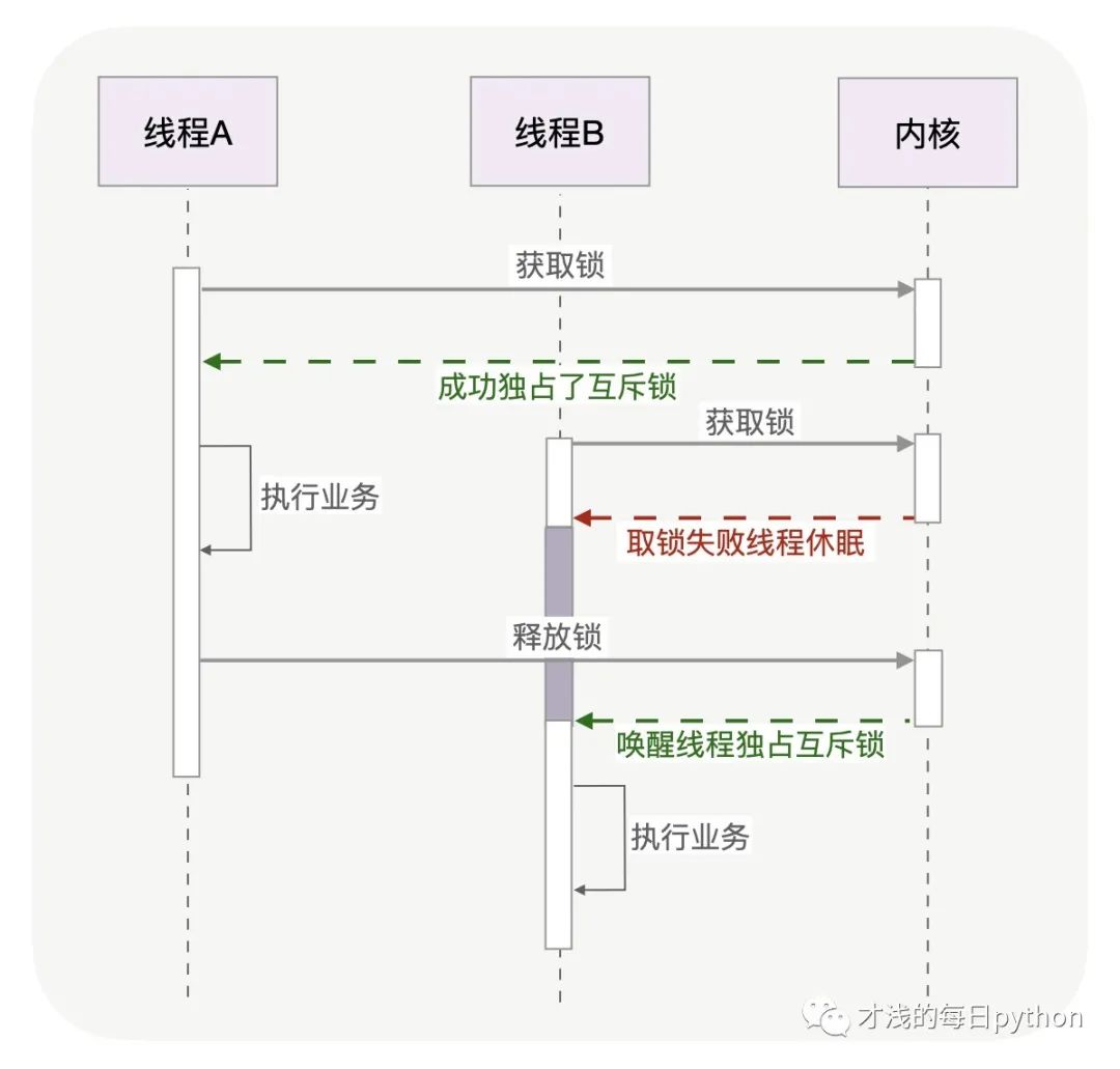 互斥锁:当 A 线程取到锁后,互斥锁将被 A 线程独自占有,当 A 没有释放这把锁时,其他线程的取锁代码都会被阻塞。(阻塞是由操作系统内核提供的信号量实现的)