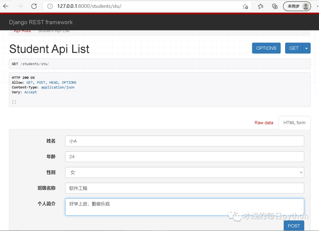 curl -X get "http://127.0.0.1:8000/students/"直接访问http://127.0.0.1:8000/students/stu/ 添加学生