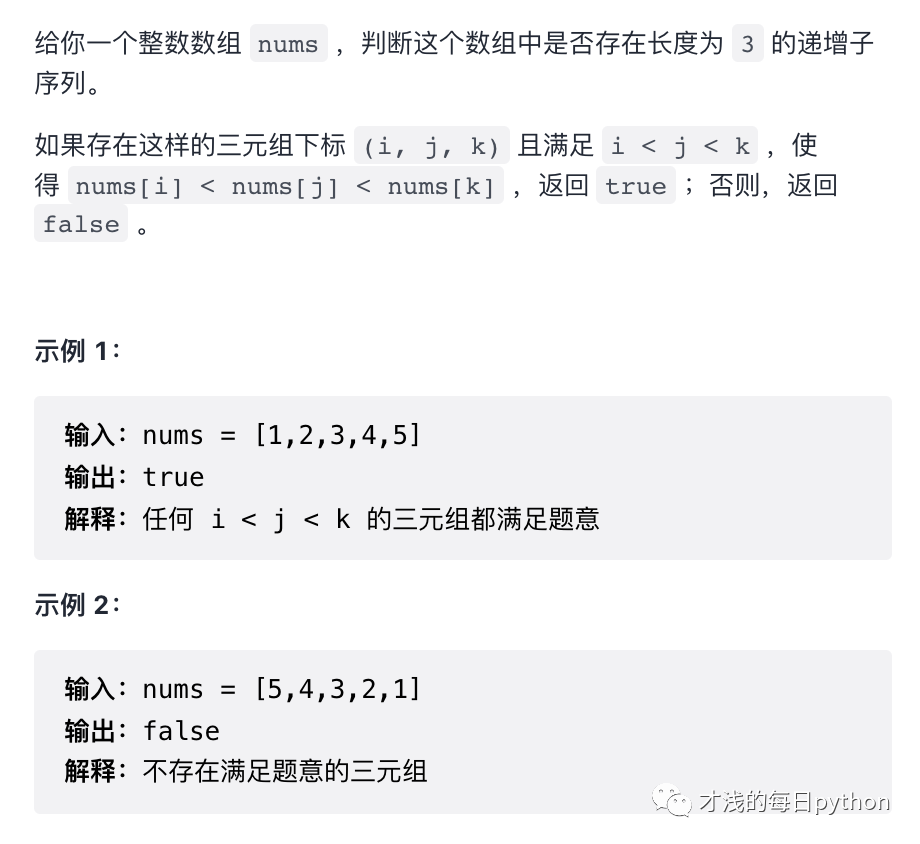 如何在只做一次遍历就得到结果呢?因为结果只有三个元素,而且是按列表下标序递增变大,那么我的思路是用一个变量去存一次遍历中列表的最小值,如果遇到比它小的就做替换;这次遍历中如果遇到比现有的最小值大的,就把它存成次小值;如果之后还有比次小值更大的,说明这个满足题意的三元组一定存在。上述过程也是唯一一种存在该三元组的情况,其他则都返回False。