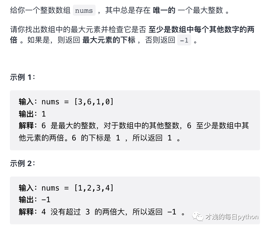 与上一题类似,结果是要大于元素其它至少2倍的元素,在一次遍历中找到最大值和次大值进行比较即可。由于要返回下标,使用enumerate()方法将下标和元素一起遍历。假设较大的元素是max_num,次大的元素是sec_num,一次遍历中,如果元素大于较大元素,那么把它和它的下标存下来;继续遍历如果大于次大元素,则对sec_num更新。如果最终得到的max_num >= 2 * sec_num,则返回较大值的下标,否则为-1。