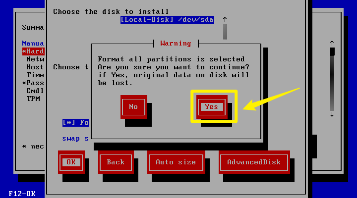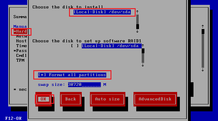 按空格键选中光标所选项目。选择磁盘,配置swap分区。