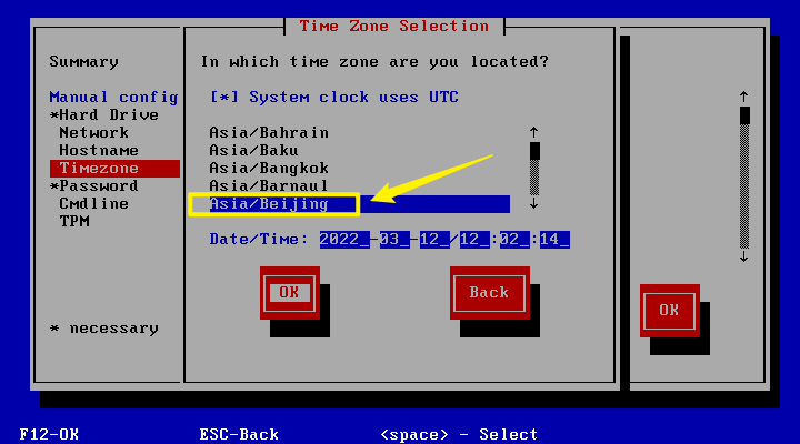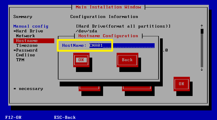 在主机配置阶段,需要配置磁盘信息(Hard Drive)、网络信息(Network)、主机名(Hostname)、时区信息(Timezone)以及密码(Password)。