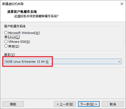 选择客户机操作系统。这里选择“SUSE Linux Enterprise 15 64位”。