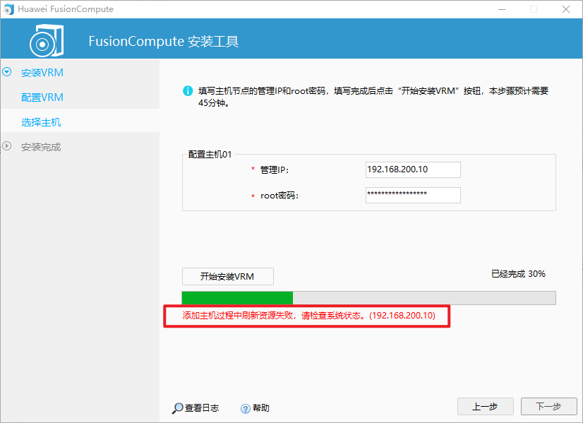 本实验一开始想采用FusionCompute提供的VRM安装部署工具进行便捷安装的,但是没想到进行到后面,一直卡在那边,一直提示报错信息,多次调整配置方法,尝试新的部署方式。依旧没能解决此问题。
