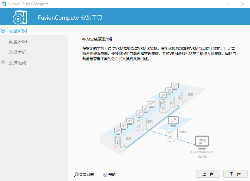 通过使用FusionCompute安装工具完成FusionCompute的安装部署,包括安装主机(已安装完成)以及VRM。主备部署时,需将主备节点分别部署在不同的主机之上。