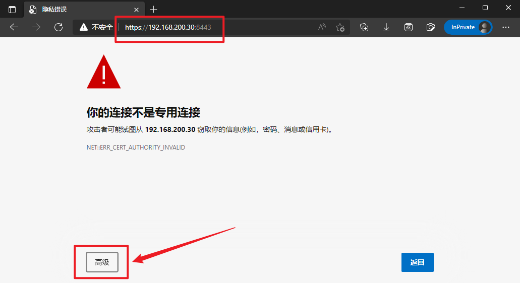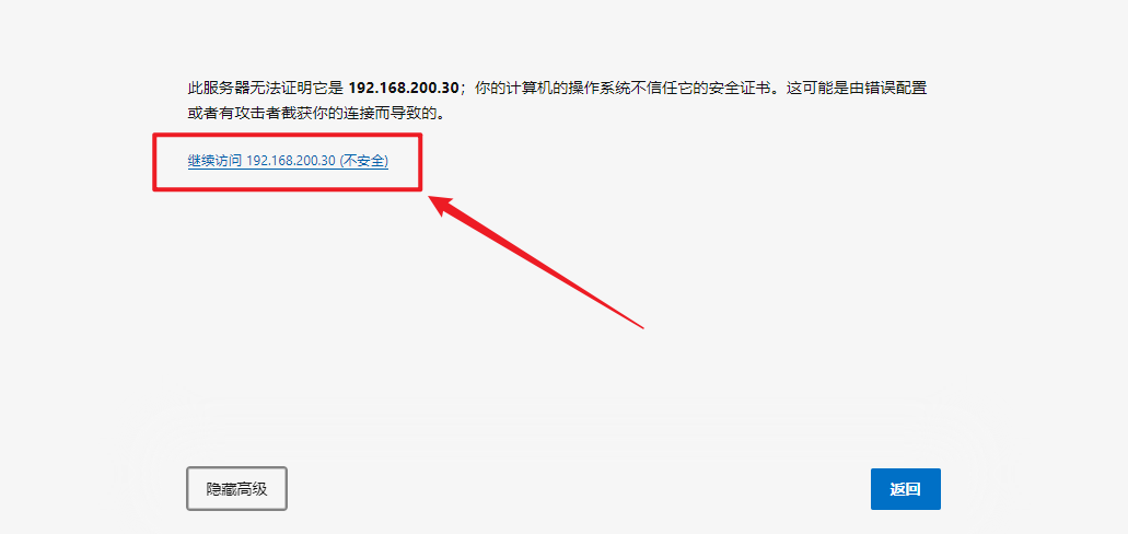 点击“高级”。继续访问此IP地址。