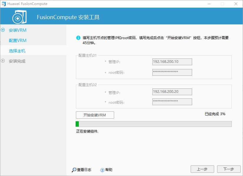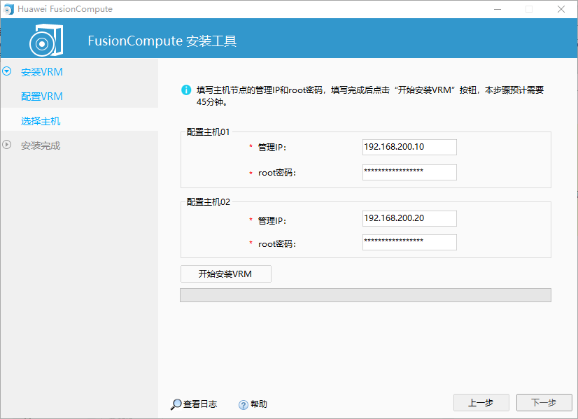 填写主机管理IP地址(之前部署过的两台CNA主机的IP地址),单击“开始安装VRM”。