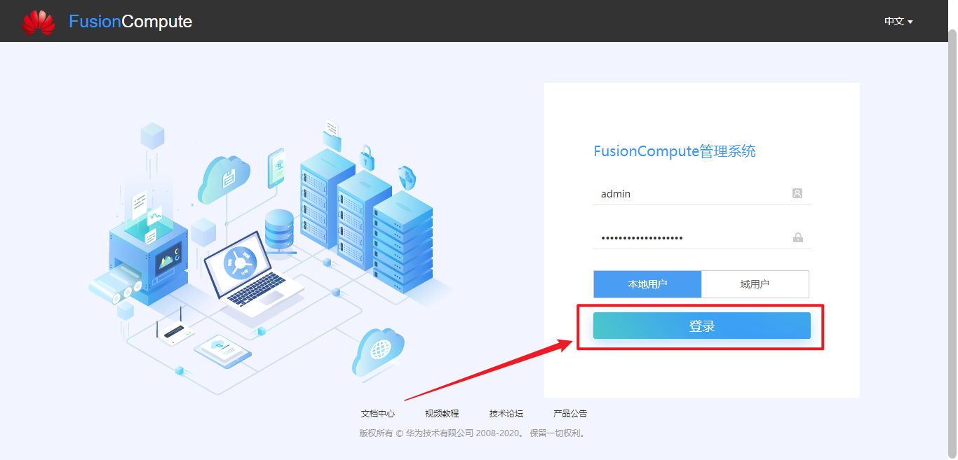 打开浏览器,输入VRM管理节点的IP地址。 本例VRM管理节点的IP地址:https://192.168.200.30:8443/
