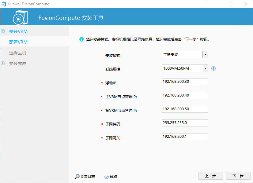 安装方式:主备安装; 系统规模:1000VM,50PM 浮点IP地址:192.168.200.30 主VRM节点管理IP:192.168.200.40 备VRM节点管理IP:192.168.200.50 子网掩码:255.255.255.0 子网网关:192.168.200.1