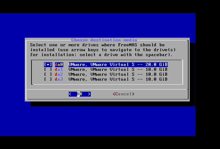 7、选择FreeNAS系统安装的硬盘,按空格键进行选择或取消。按回车键继续。