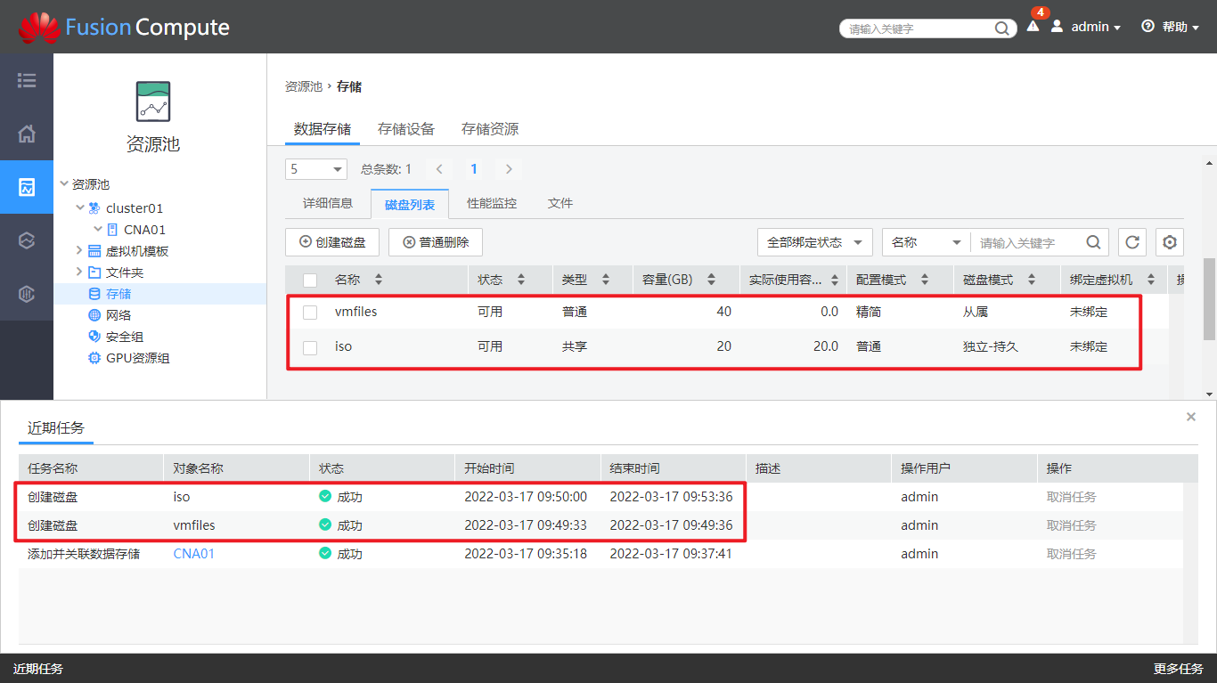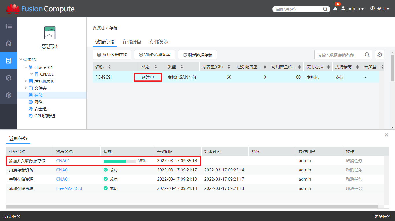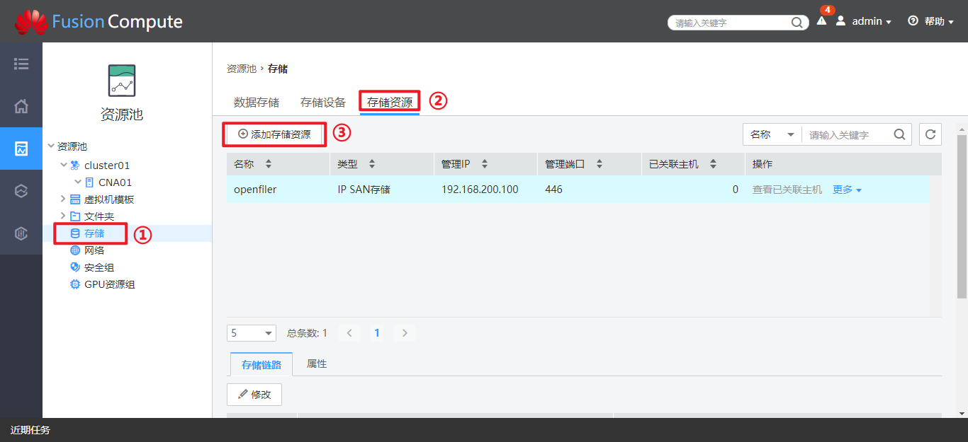 配置存储资源信息。 在FusionCompute上配置存储设备的管理IP和存储IP,用于主机识别存储设备。相应的,主机上也应已添加了存储接口,用于与存储设备的存储IP进行通信。