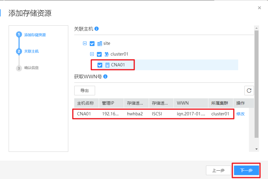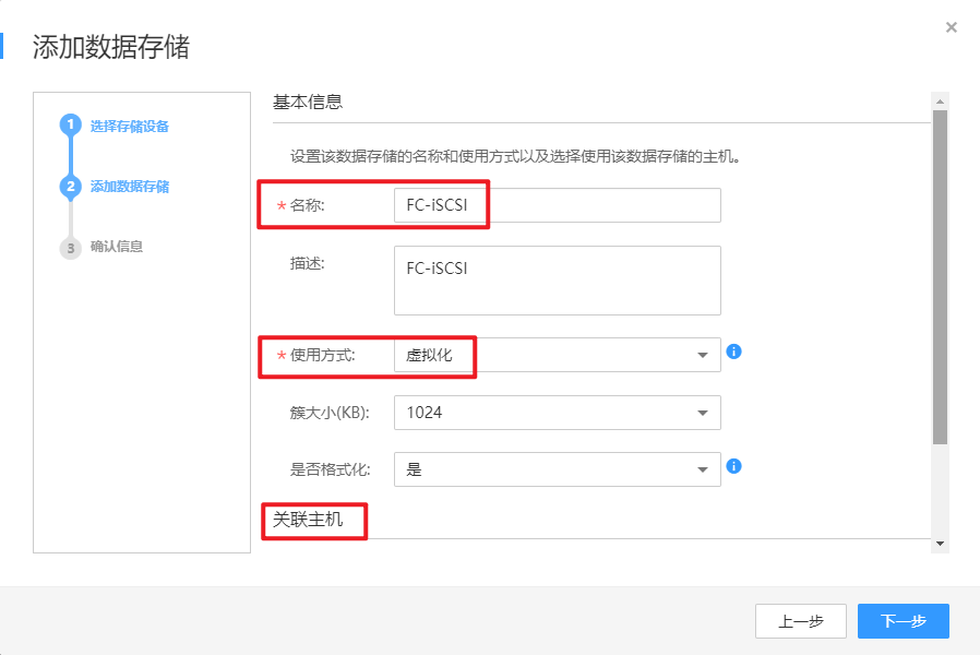 添加数据存储信息并关联主机。