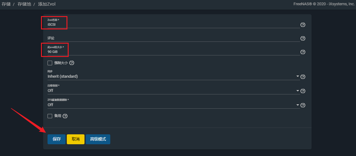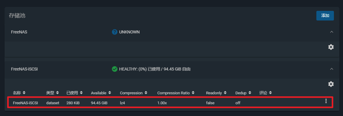 配置Zvol 是表示块设备的数据集。配置 iSCSI 共享时需要这些。 参考链接:https://www.truenas.com/docs/core/storage/pools/zvols/ 点击"添加Zvol"