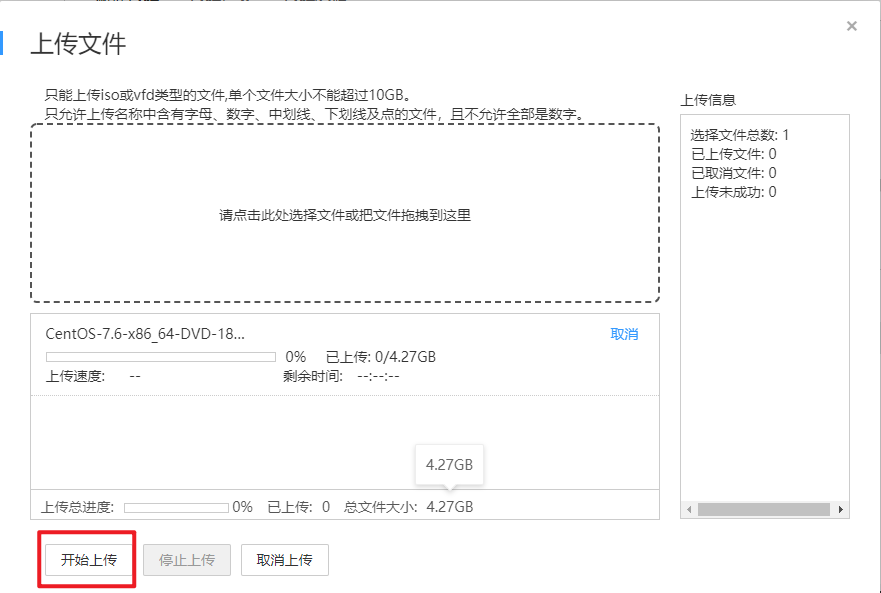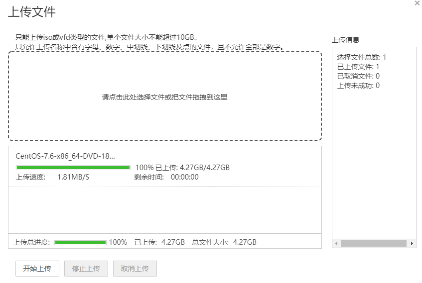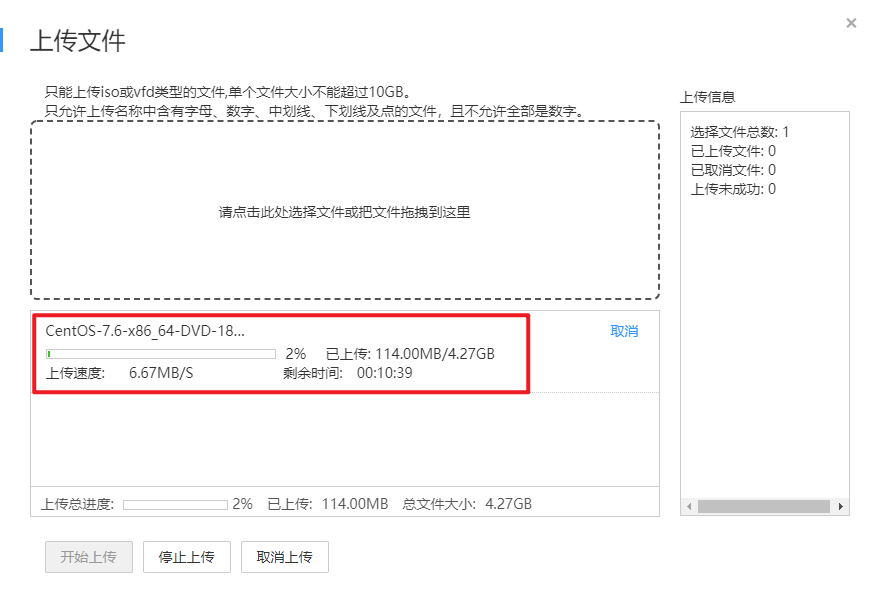 选择上传的文件。 注意:只能上传iso或vfd类型的文件,单个文件大小不能超过10GB。只允许上传名称中含有字母、数字、中划线、下划线及点的文件,且不允许全部是数字。