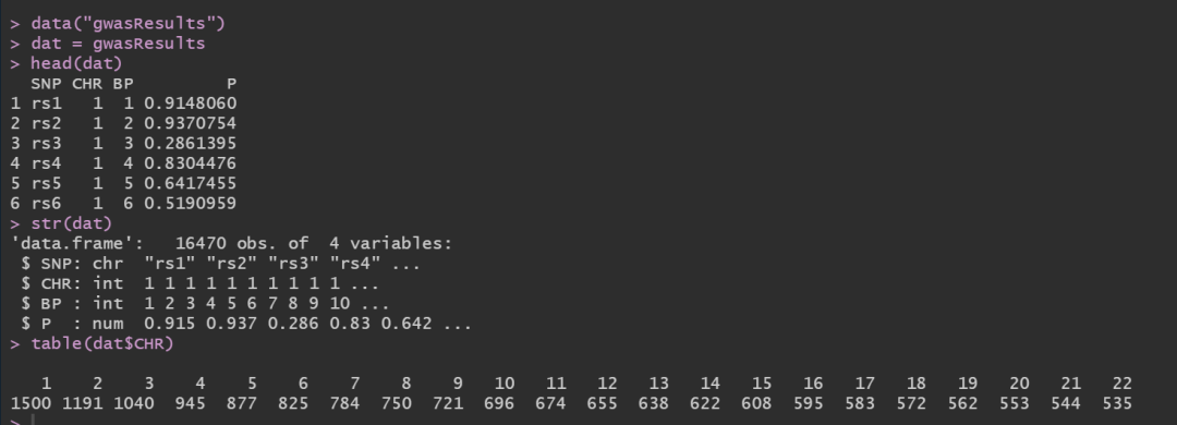 使用qqman中的gwasResults数据集:
