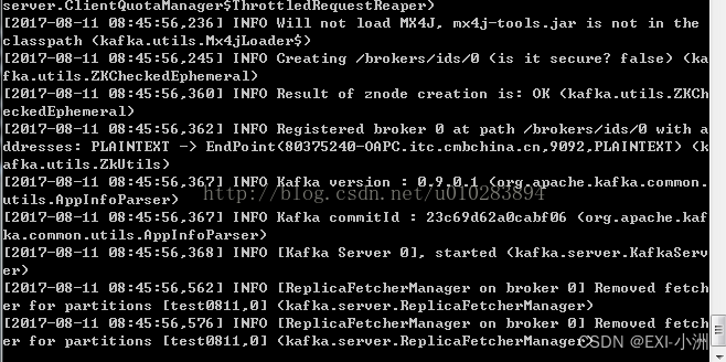 提示:请确保启动kafka服务器前,Zookeeper实例已经在运行,因为kafka的运行是需要zookeeper这种分布式应用程序协调服务。