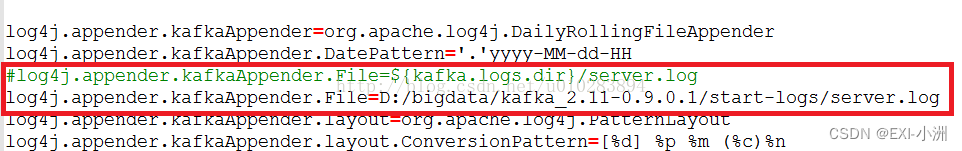 log.dirs=/tmp/kafka-logs to log.dirs=D:/bigdata/kafka_2.11-0.9.0.1/kafka-logs 或者 D:\bigdata\kafka_2.11-0.9.0.1\kafka-logs