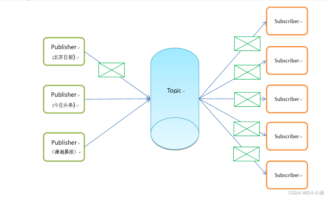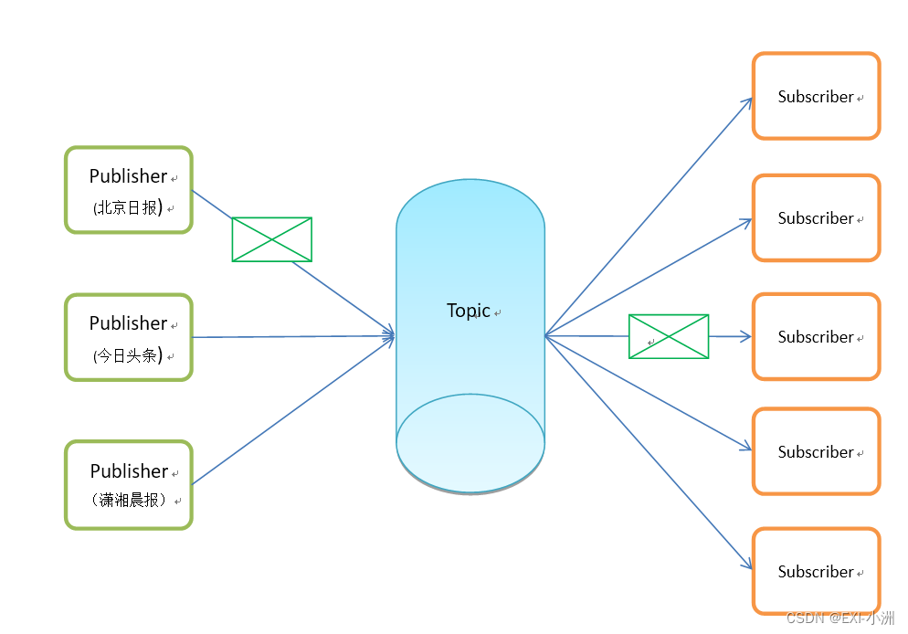 发布订阅模式:(一点对多模式,通俗的讲又叫广播模式),一方发送消息,多方接收(群发)
