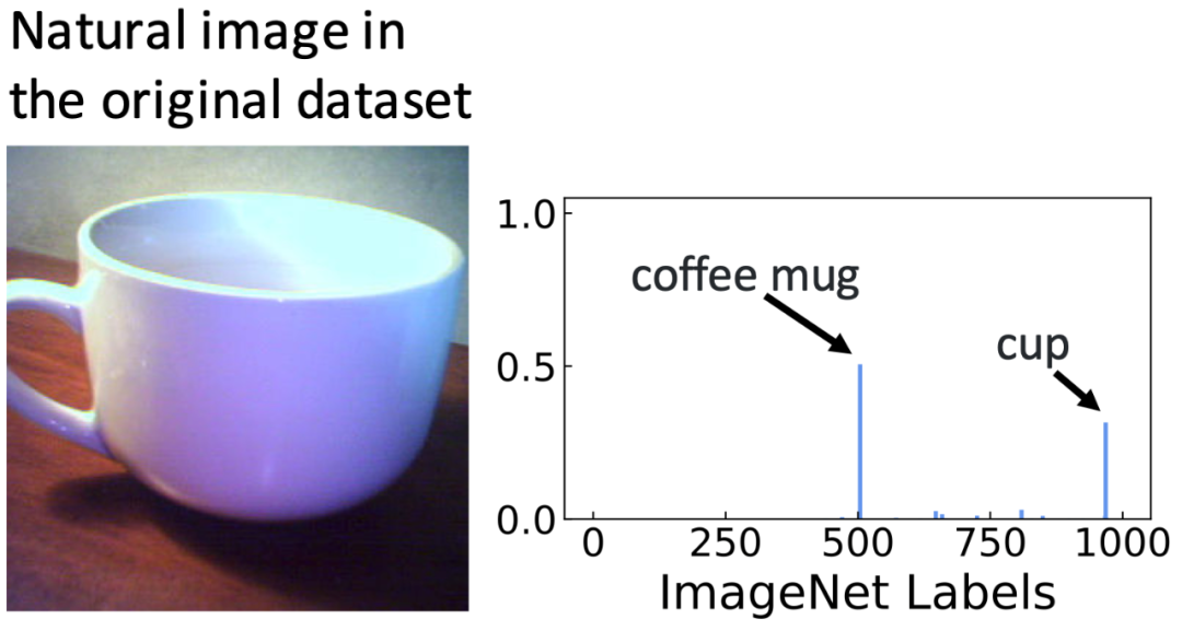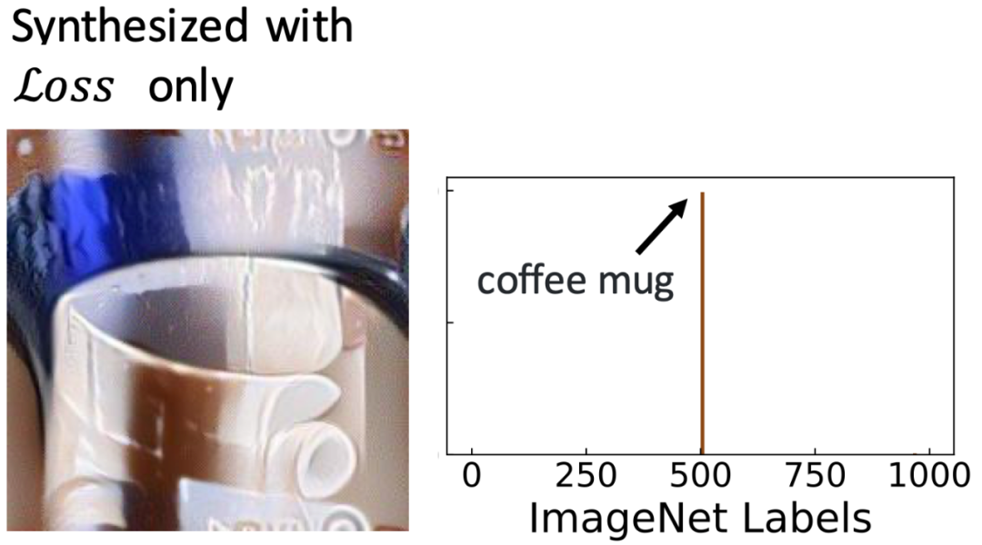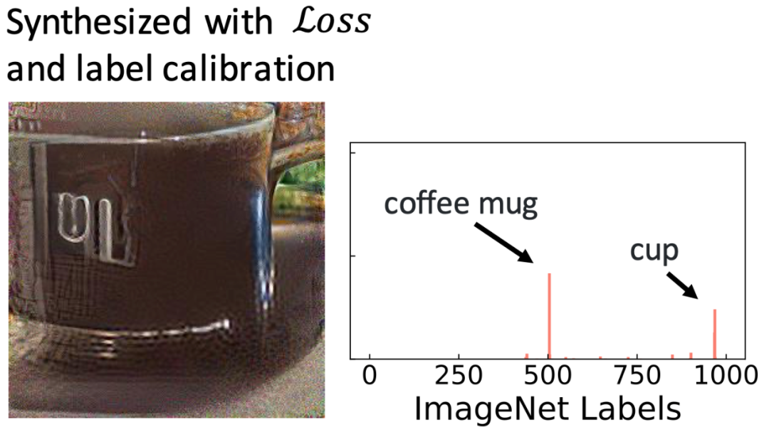然而针对某一个标签生成的图片往往容易过拟合,从而有极大的预测值在该标签上,但无法发掘语义近似的标签之间的联系,比如下图的 (b) 中,针对“咖啡杯” 类合成的图像,预训练模型仅预测该图像为“咖啡杯”,使得图片过分强化咖啡杯的特征,且不像真实图片。
