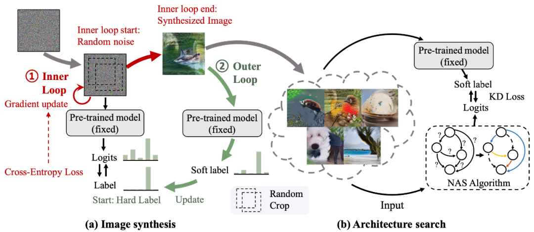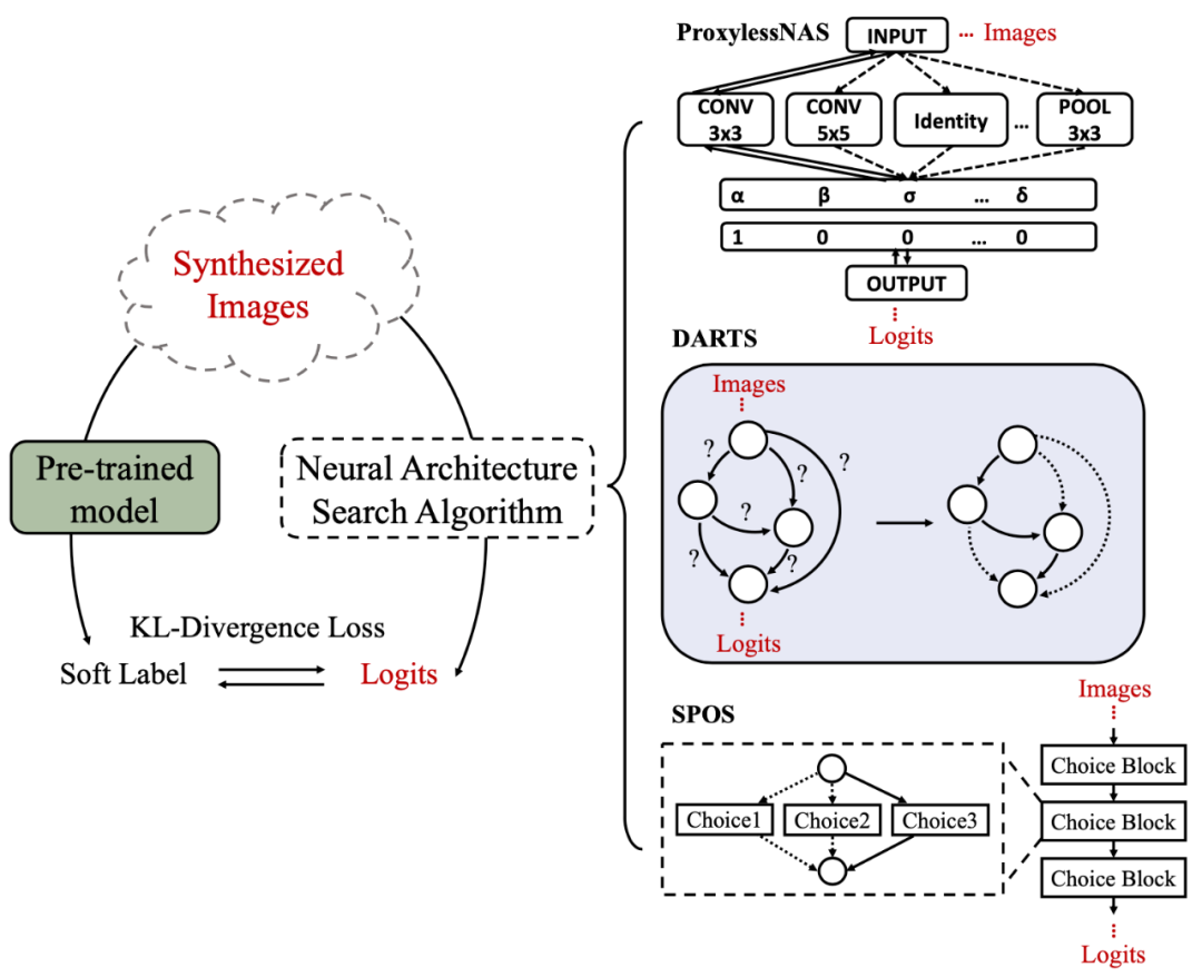Data-free NAS 的架构非常简单,分为两步,第一步用预训练网络模型生成数据,第二步用生成的数据和预测的标签(label)来训练 NAS。